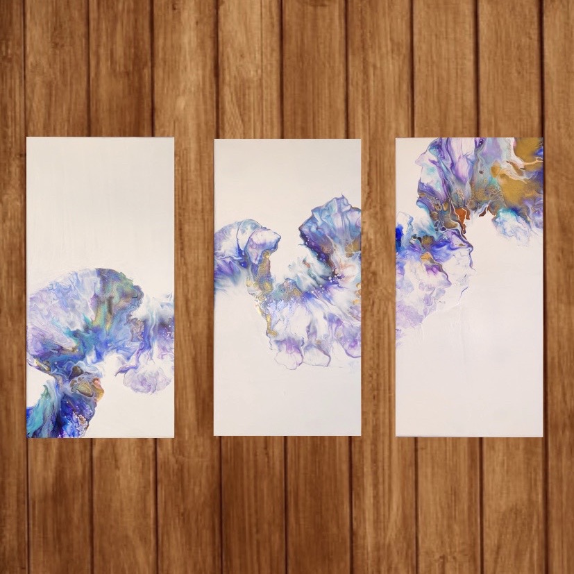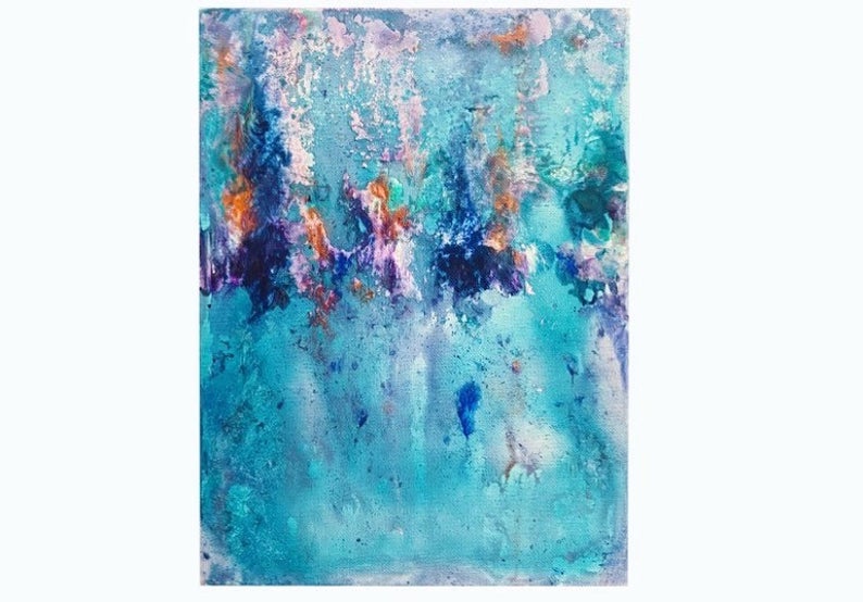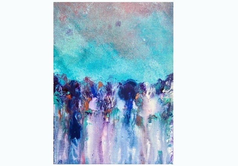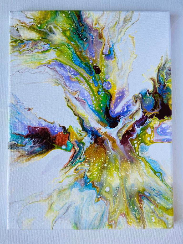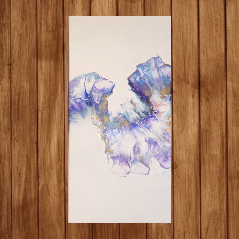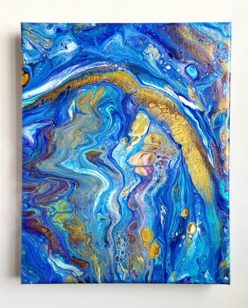 Lately I’ve been really drawn to water, as I always have been when my mind has been a mess. The calming, continuous motion of even a thundering waterfall has always eased my whirling mind. I tried to depict this serenity water makes me feel in the form of magical colors on a stretched canvas.