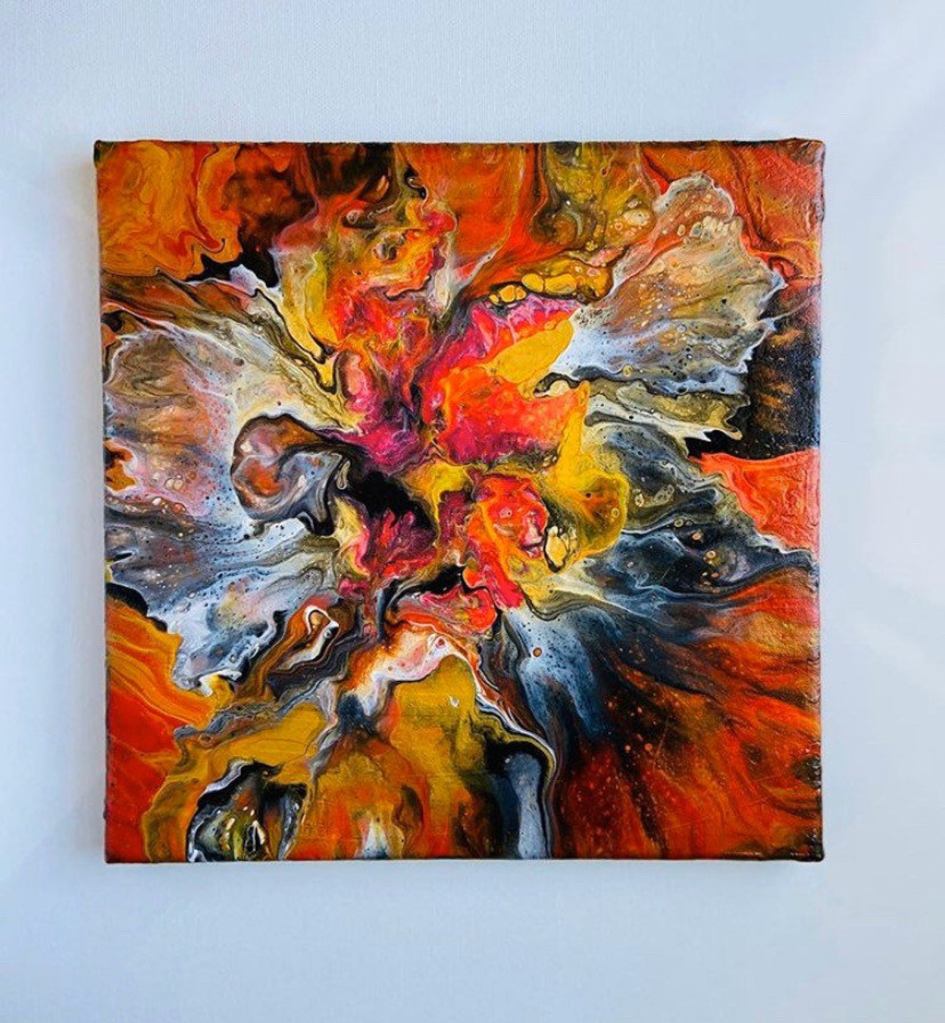 With this painting I was attempting to depict the beauty of struggle often found in life. Like a piece of coal turns into a diamond under pressure or a Phoenix is reborn more beautiful than ever after enduring flaming agony, I believe struggles shapes us as people, which is why I used the modeling paste to give this a rougher quality. I poured a red, yellow, gold and black flip cup for the background, representing fire and ash. The miniature Dutch pour, consisting of gold, white, red, and some dark pink, reminds me of a flower, like a poppy using the ashes of disaster as fertilizer to grow strong and vibrant instead of letting tragedy be her demise.