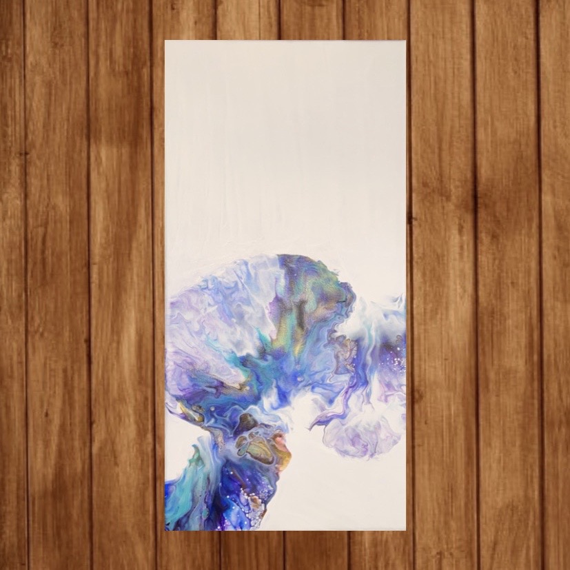 Abstract depiction of a bioluminescent, translucent jellyfish made with liquid acrylic paints on a 10x20in canvas.